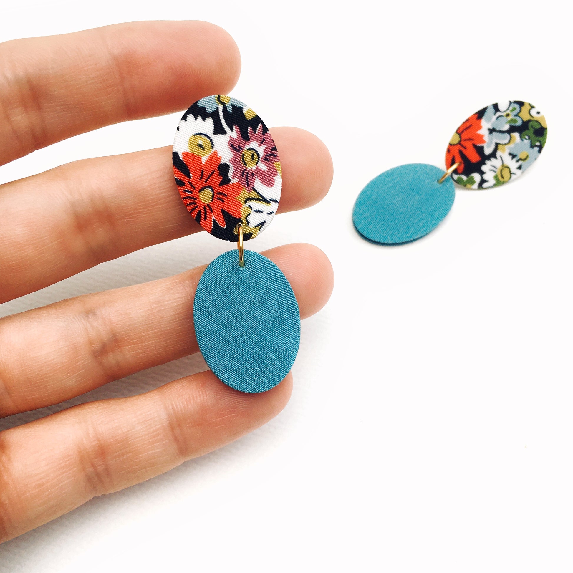 Lovely earrings, lightweight made from up-cycled cardboard cover with carefully chosen vintage silk fabric added to plywood.