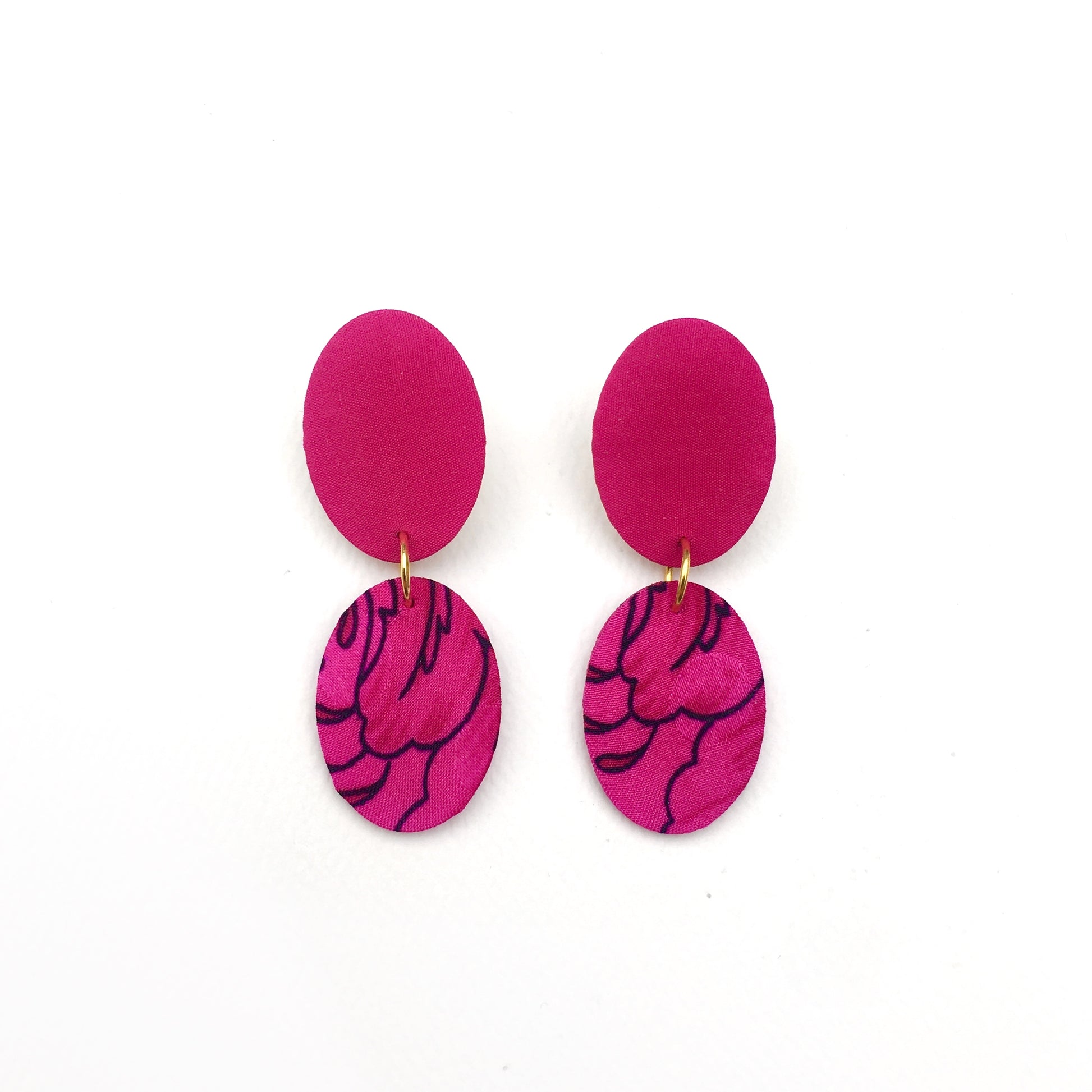 Lovely earrings, lightweight made from up-cycled cardboard cover with pre-loved silk fabric attached to plywood.
