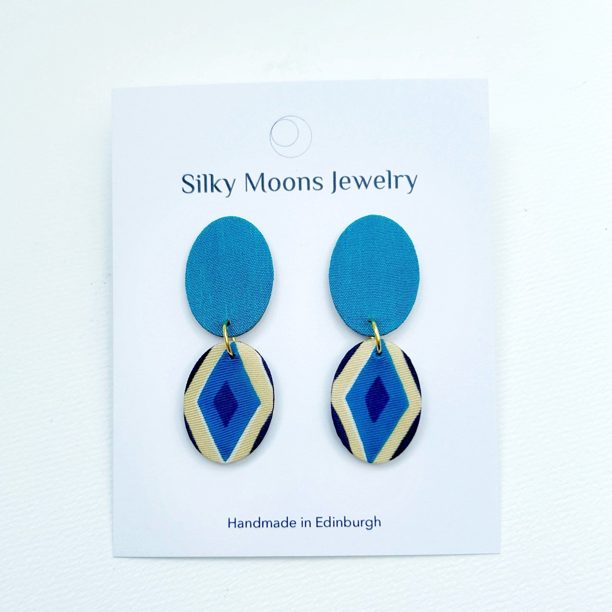 Lovely earrings, lightweight made from up-cycled cardboard cover with vintage silk fabric added to plywood.