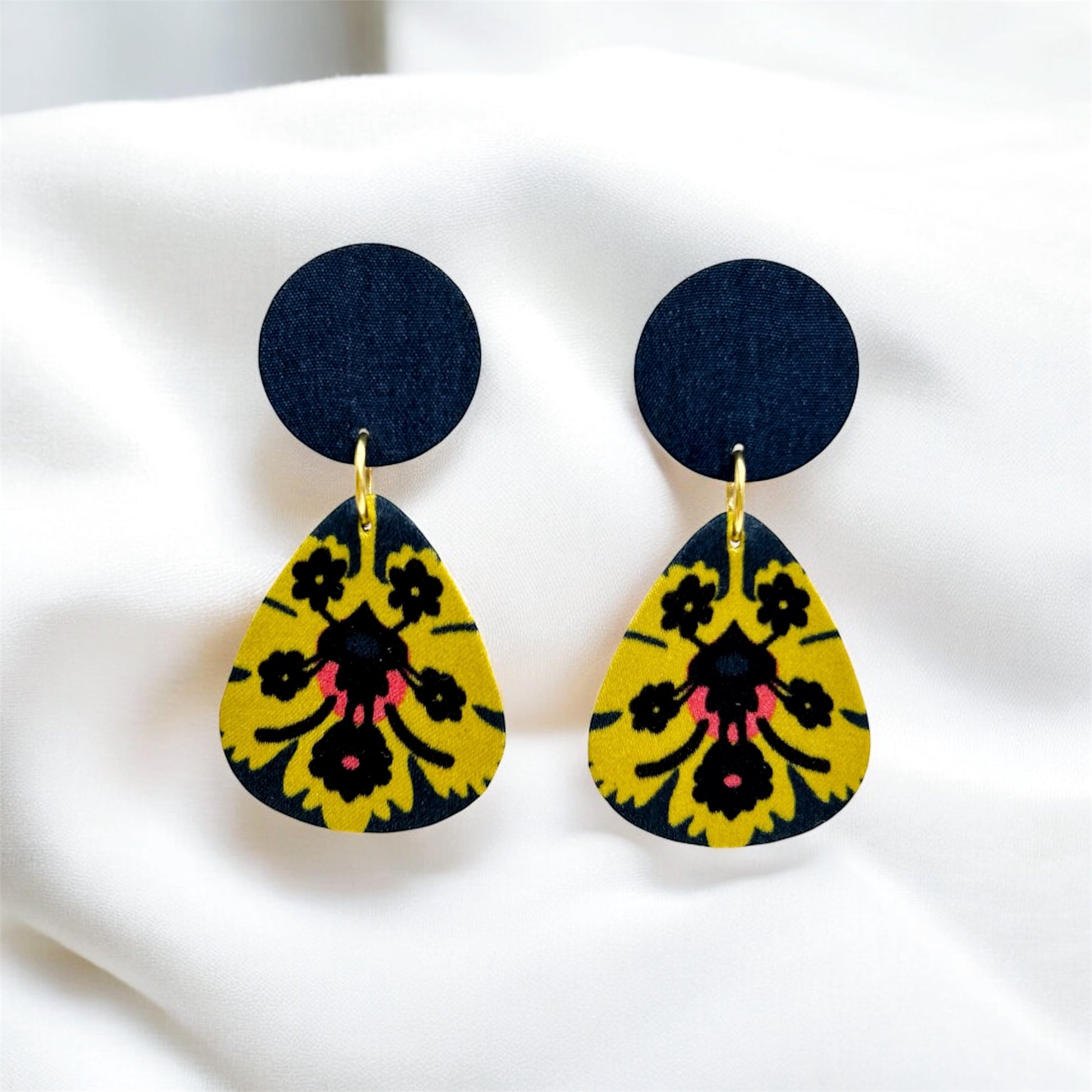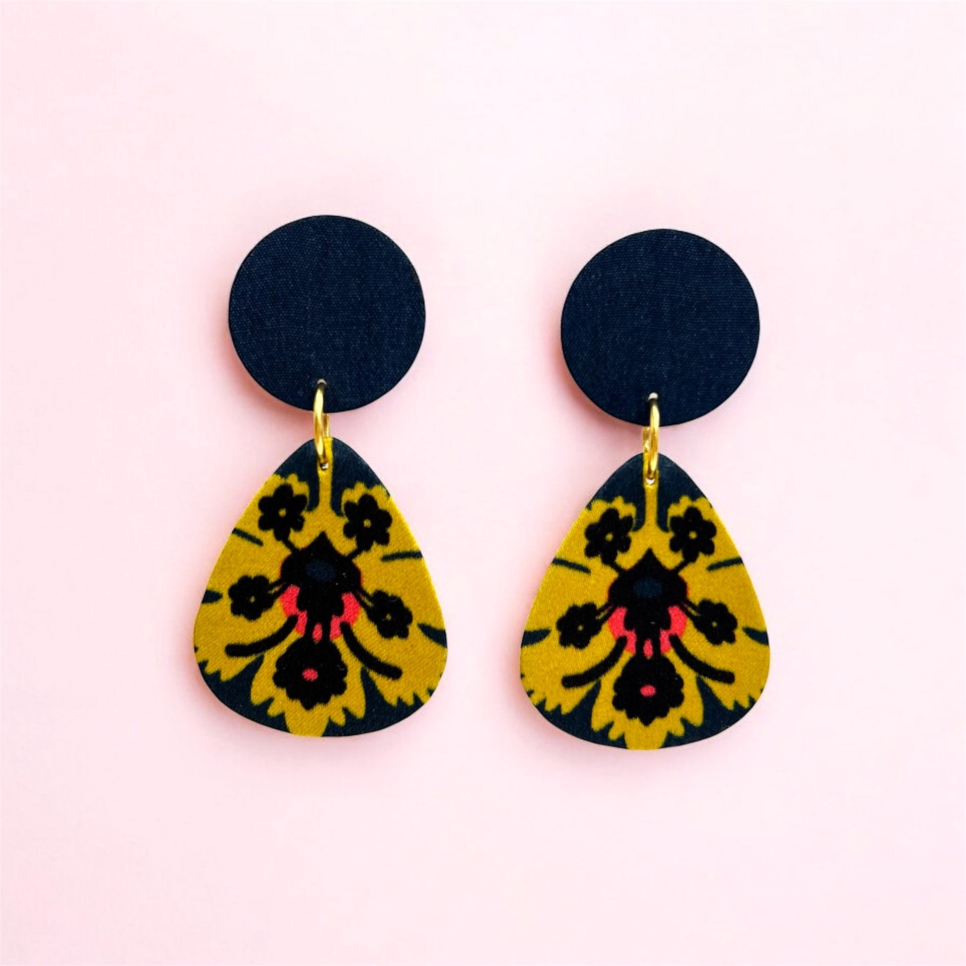 Lovely earrings, lightweight made from up-cycled cardboard cover with Liberty silk fabric attached to plywood, hand painted in gold at the back.
